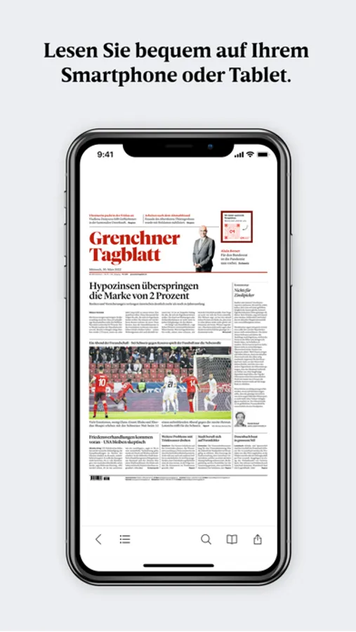 Lesen Sie die aktuellen Zeitungsausgaben des «Grenchner Tagblatts» bequem auf Ihrem Smartphone und Tablet. Es stehen Ihnen dazu das Zeitungslayout oder die mobile Leseansicht, optimiert für kleinere Bildschirme, zur Verfügung.