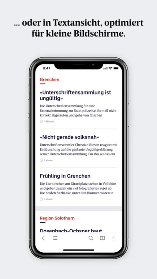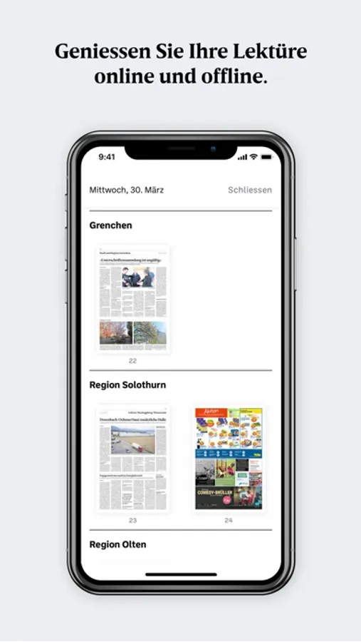 Das «Grenchner Tagblatt» steht täglich bereits ab 4 Uhr morgens in der E-Paper-App bereit. Die Ausgabe wird wahlweise automatisch oder manuell heruntergeladen. Sobald die aktuelle Ausgabe heruntergeladen ist, lesen Sie diese auch ohne Internetverbindung, zuhause oder unterwegs.