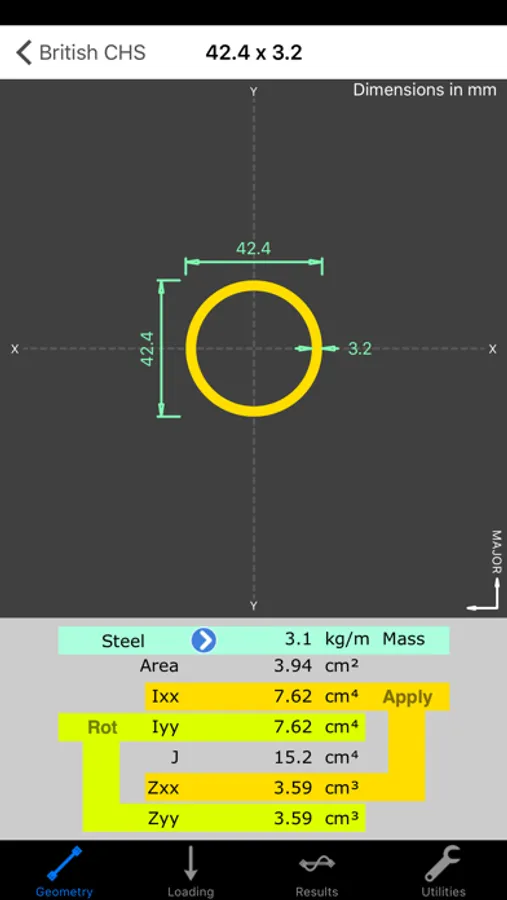 - Calculates: Area, Inertia, Torsional constant, Elastic moduli, mass.