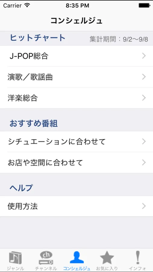 ・USENのチャンネル番号や音楽ジャンルからの検索の他に「カフェ」「居酒屋」などのロケーションからの検索や
