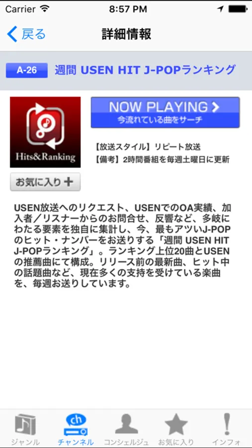 ・各番組内で、今現在流れている楽曲の曲名とアーティスト名をリアルタイムで表示するNOW PLAYING機能があります。