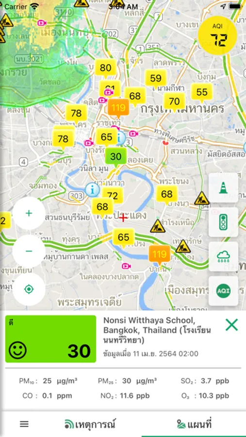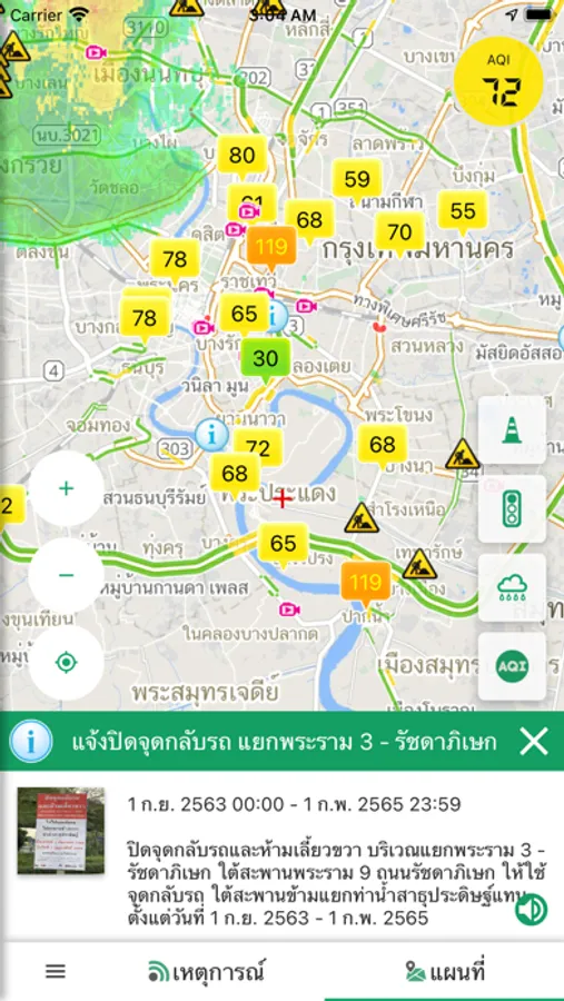 ข้อมูลเส้นสีแสดงความติดขัด (แดง เหลือง เขียว) กล้องวงจรปิด เหตุการณ์ก่อสร้าง อุบัติเหตุ และอื่นๆ อีกมากมาย