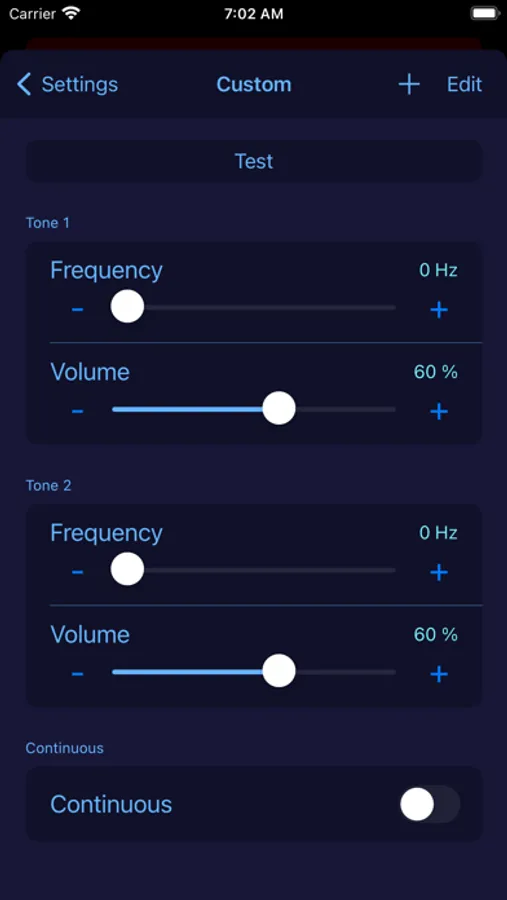 Create a custom tone with control over individual frequencies and volumes. The custom tone can consist of any number of on and off pulses and can optionally be continuous.