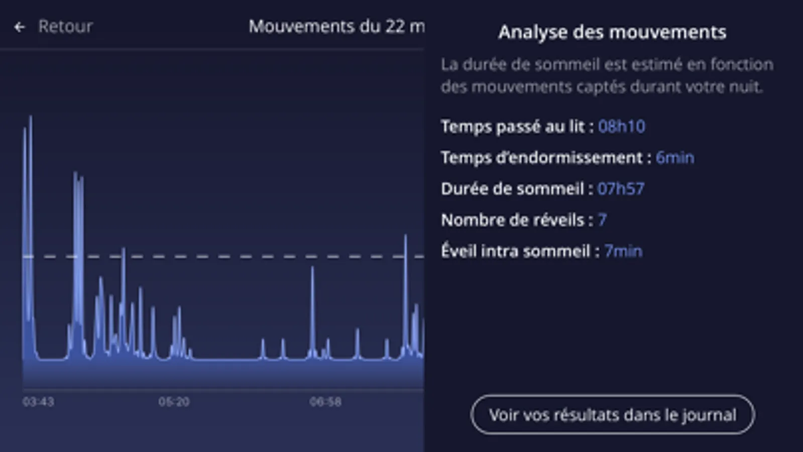Captation de vos mouvements et votre temps d'endormissement à l'aide de l'accéléromètre. Une fois votre nuit terminée, consultez le graphique correspondant pour connaître vos phases d'éveil et de sommeil.