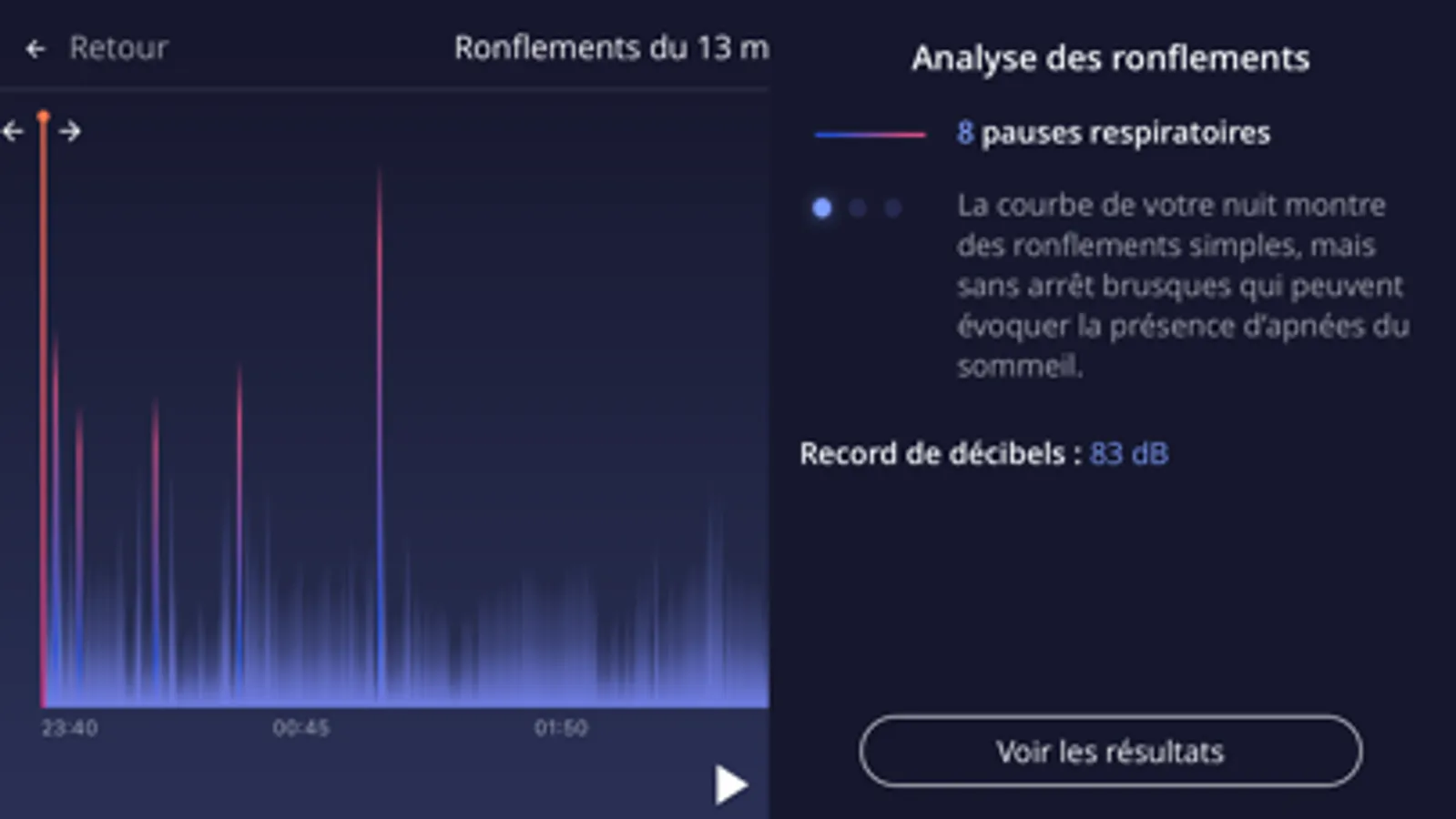 En fin de nuit, l'application permet d'écouter des extraits sonores de vos ronflements et d'éventuelles pauses respiratoires à l'aide de vos écouteurs.