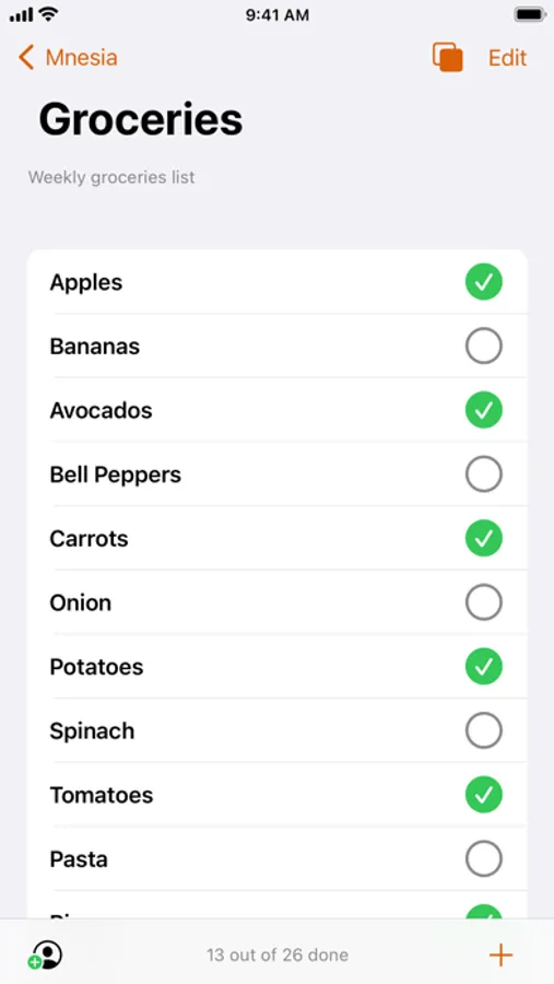 With Mnesia you can share checklists and collaborate on a shared checklist with your friends/family/colleagues/team mates.