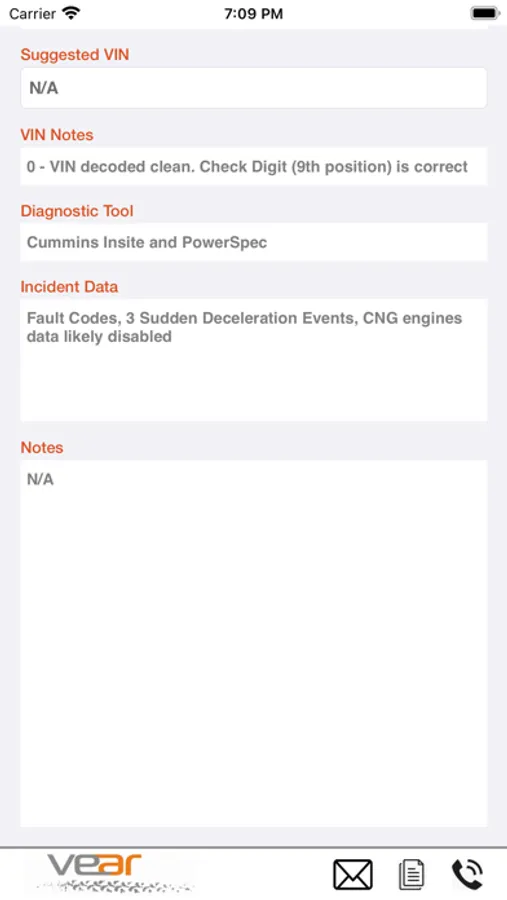 The form can then be emailed. The user may choose between the default address support@vearexperts.com, or any email address. The results can also be copied and pasted into an email or text message.