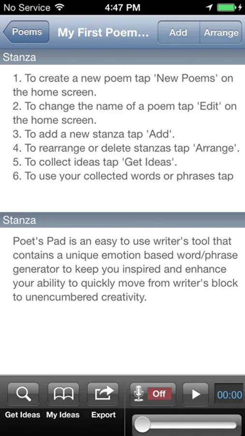 - Easily export poems as text documents along with audio recordings via e-mail.