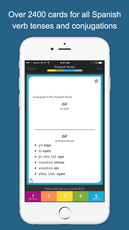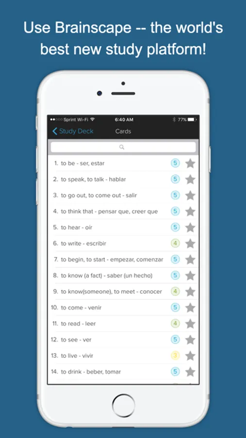 Nail the most common verbs on your Spanish quizzes and in everyday Spanish language. Drill yourself on Spanish verbs MORE EFFICIENTLY than with any other app on iTunes. Applying the latest in cognitive science, Brainscape repeats conjugations in the optimal pattern of repetition until you have truly internalized them.