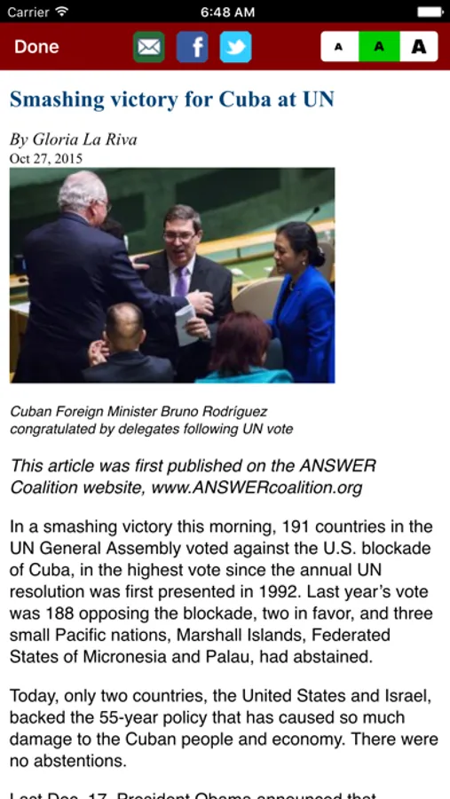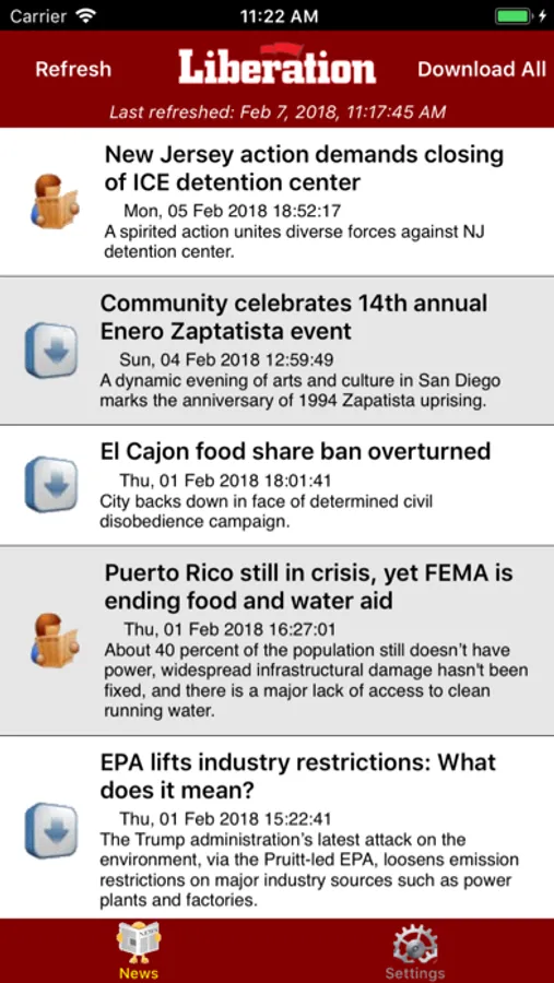 Customized iPhone/iPod Touch/iPad newsreader for the LiberationNews.org. Features user-selectable automatic or manual refresh of article lists from Liberation News, and caching of downloaded articles to read while offline. Download all the latest articles at home or at a coffee shop, then read them on the train or bus, at the gym, or while walking to work (or, for that matter, at work!). Story display is optimized for the iPhone/iPod or iPad, as appropriate. Old articles are automatically purged from the cache when they disappear from the article list. Share articles with your friends via Facebook, email, and Twitter!