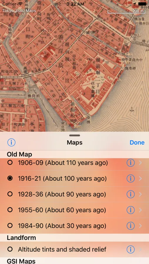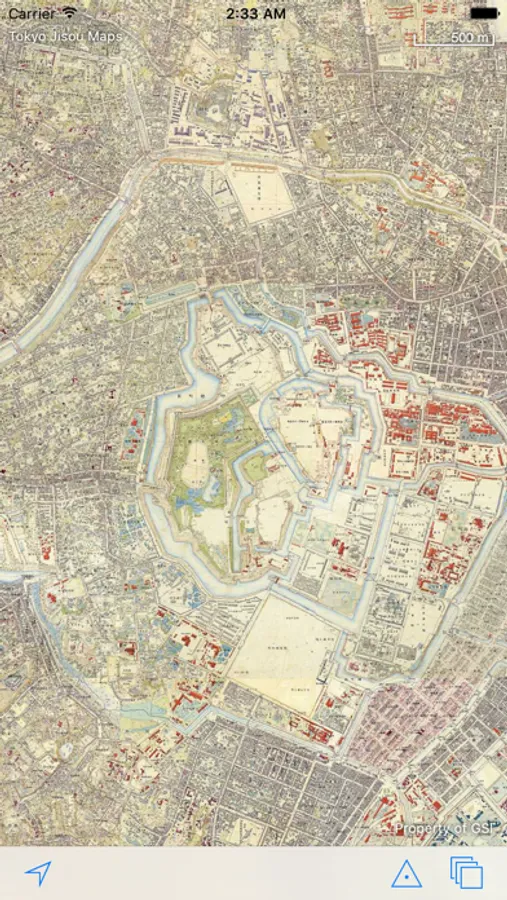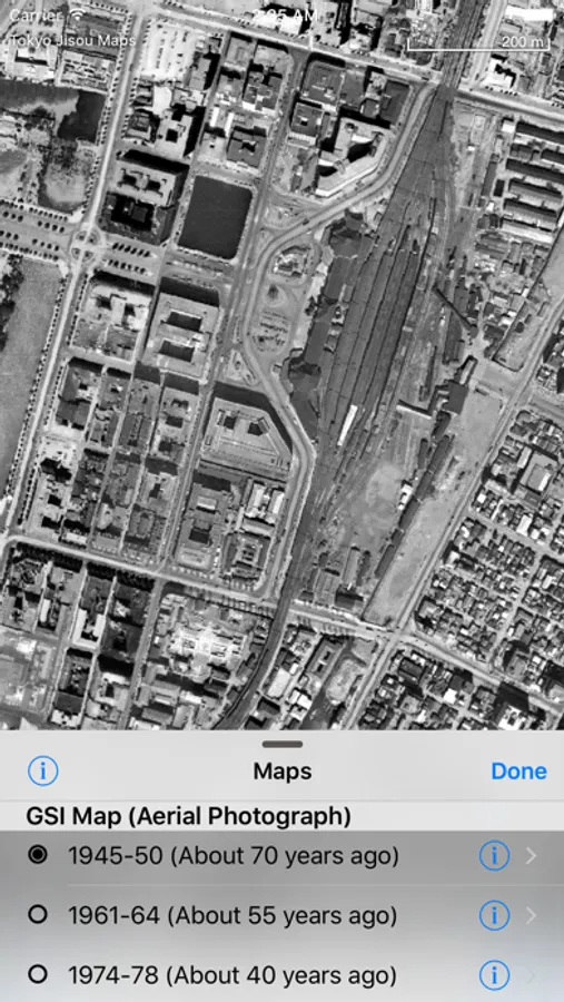 "Jisou" means "layers of time." The maps and aerial photographs in this app show Tokyo at different moments in the past.