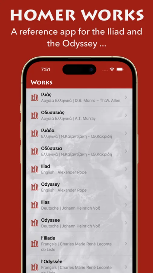 HOMER WORKS is a reference app to the Greek poet's major works, the Iliad and Odyssey including the ancient Greek texts (D. B. Monro - Th. W. Allen) and translations in modern Greek (N. Kazantzakis and I. Kakridis), English (A. Pope), French (C. M. R. Leconte de Lisle) and German (J. H. Voß).