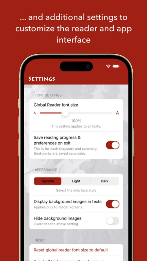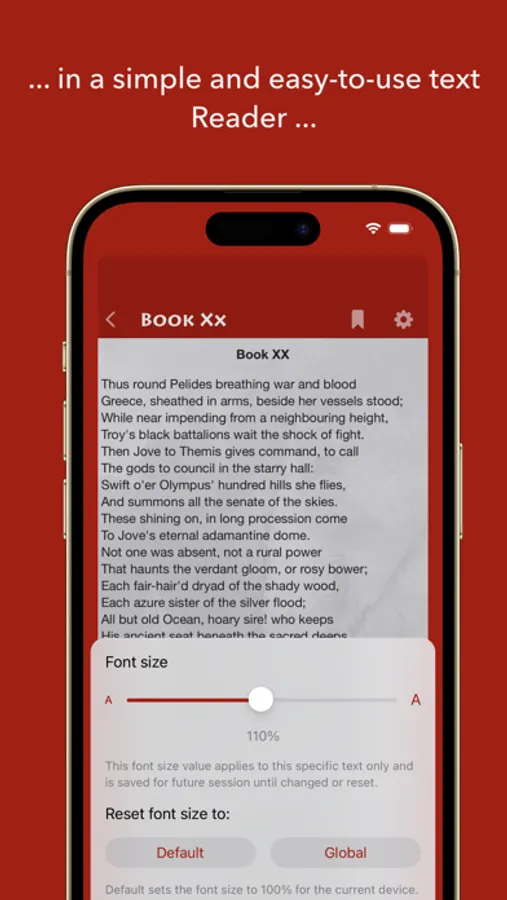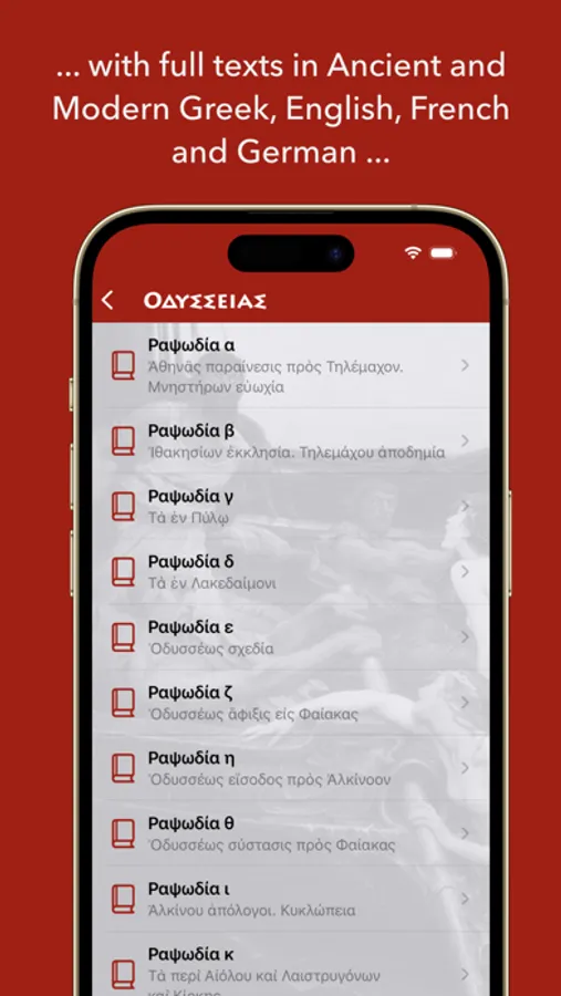 The app includes a simple and easy-to-use reader, with bookmark support, text size management and reading snapshots to remember the last reading position. Several options provide customization to the text reader and user interface featuring art masterpieces inspired by Iliad and Odyssey being displayed in the background.
