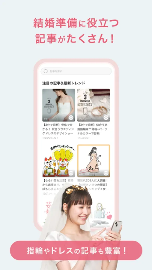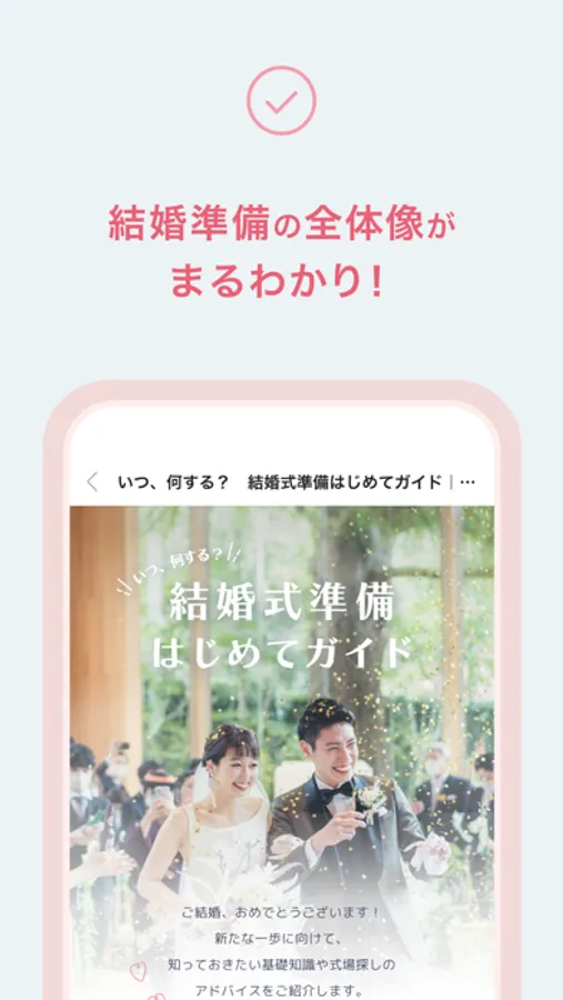 結婚準備のノウハウから、アプリでしか読めない特集記事、結婚式場・指輪・エステ検索、結婚式・新生活準備のダンドリチェック機能まで充実!