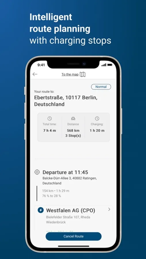 The new update of the DKV Mobility App not only gives you access to over 66,000 fuel stations, but to also more than 200,000 public charging points in our network. It's easy and is just one click away. Another unique feature is the intelligent route planning, where the DKV Mobility App automatically calculates the best route with optimal charging stops for long distances.