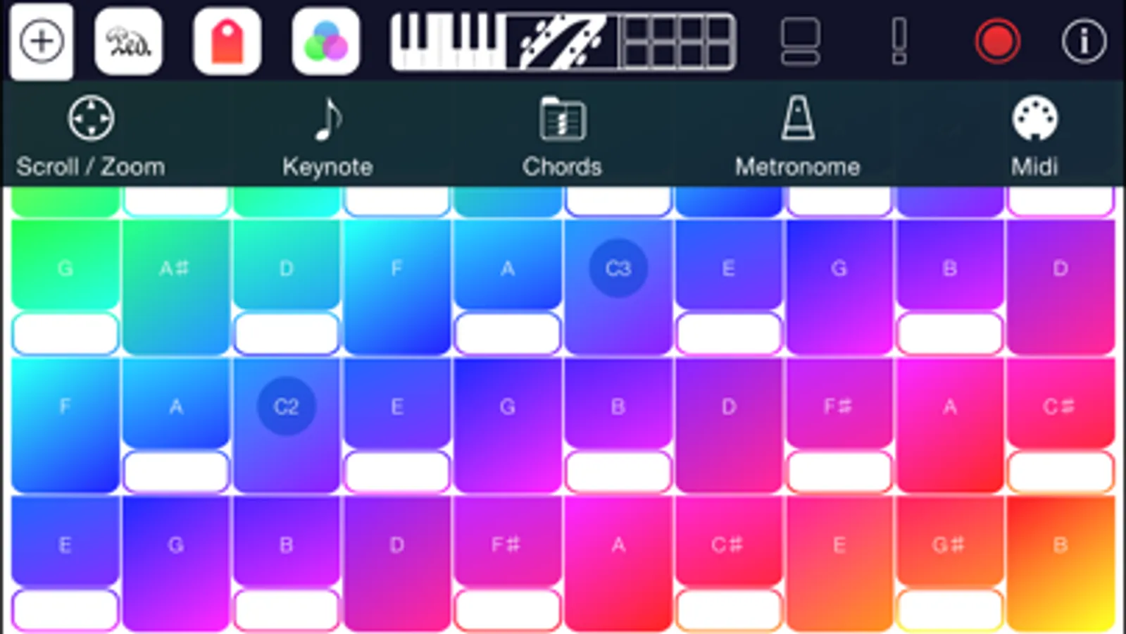 Simple Music is a novel arrangement of notes to VISUALLY and EASILY provide for playing music. SLIDING your finger from any point ALWAYS produces CHORDS. The higher importance notes and chords always surround them. It is indeed the simplest approach to playing music, with so much musical sense, it might as well become the future keyboard.