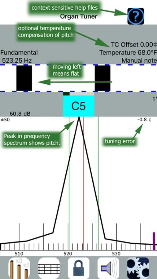 Organ Tuner has two different displays that are visible at once. One is the strobe-like Phase Display. This is a band where black squares move left or right. You tune to make the squares stop moving. The other is a Spectrum Display. This is a graph that shows a peak for every pitch present in the sound. You tune to make a peak in the graph move to a central red line. Having both the Phase Display and the Spectrum Display visible at once gives you a more complete picture of the tuning than any single spinner-type or needle-type display.