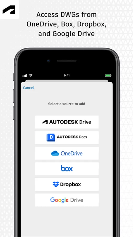 • Simplify workflows by opening DWG files directly from Autodesk Drive, Autodesk Docs, Microsoft OneDrive, Box, Dropbox, or Google Drive.