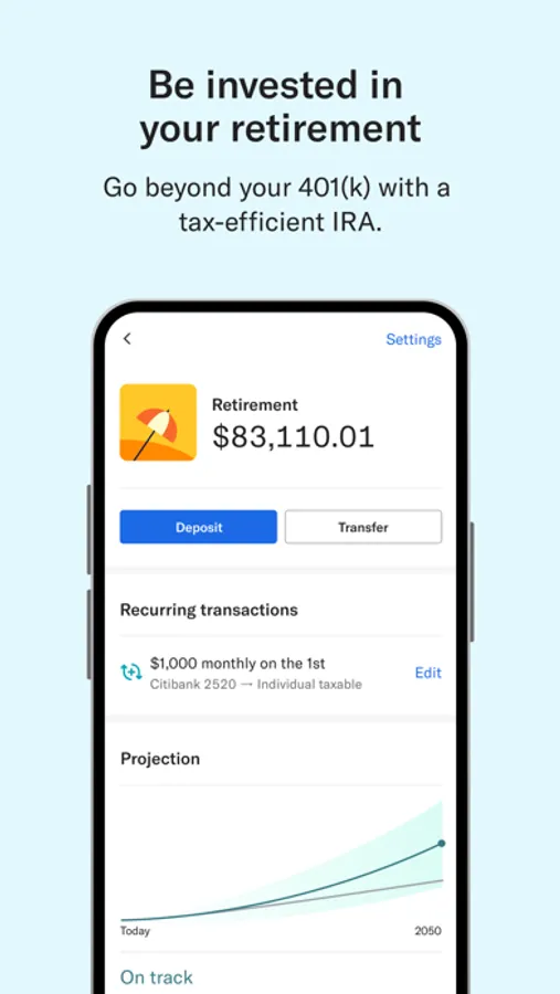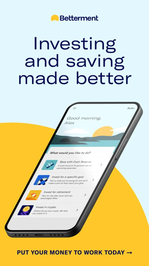 As an independent digital investment advisor and fiduciary, Betterment’s mission is to help you do what’s best for your money so you can live better. Get started in minutes with just $10 and no minimum balance. Keep track of your financial life across your short- and long-term savings goals with our easy-to-use app.