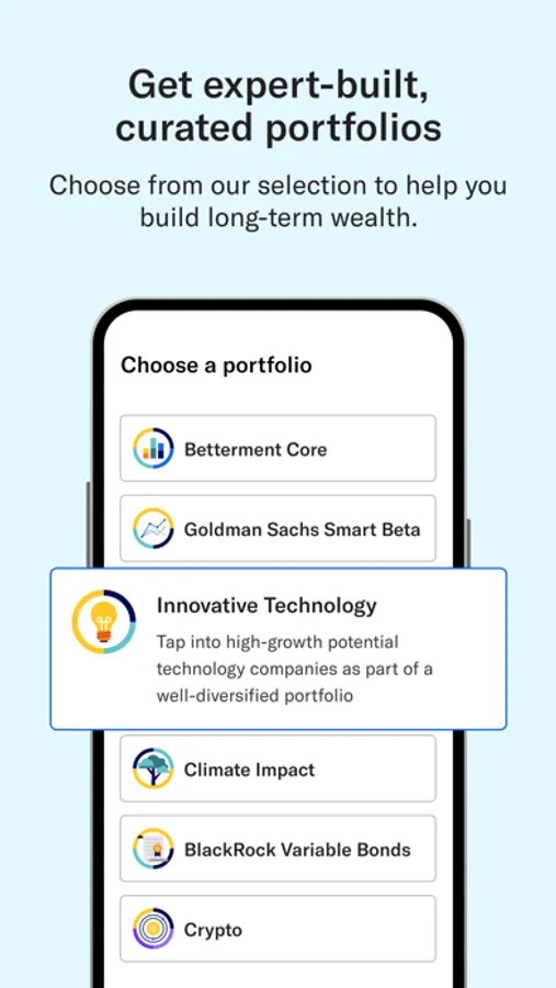- Choose one of our optimized, curated portfolios of ETFs, like Innovative Tech, Goldman Sachs Smart Beta, or socially responsible investing options: Broad, Social, or Climate Impact portfolios