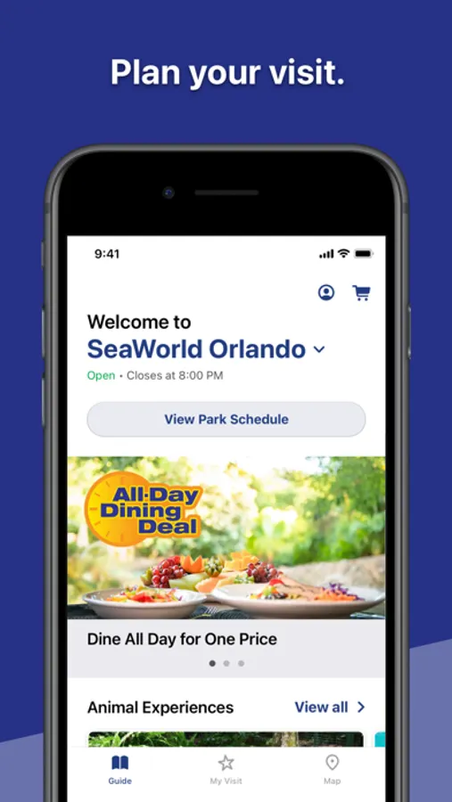 • Discover park amenities including animal experiences, shows, rides, events, and dining
