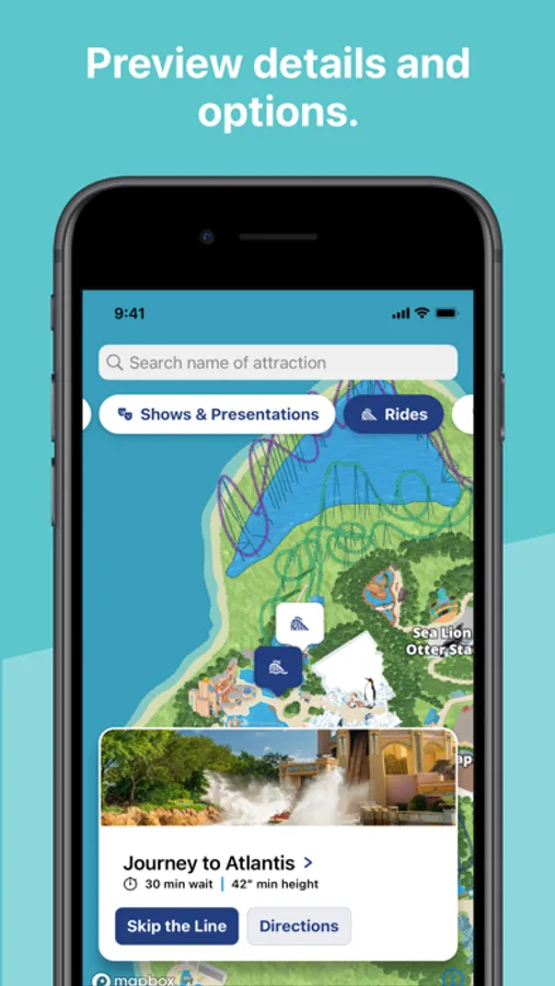 • Filter points of interest by type, including animal experiences, shows and rides