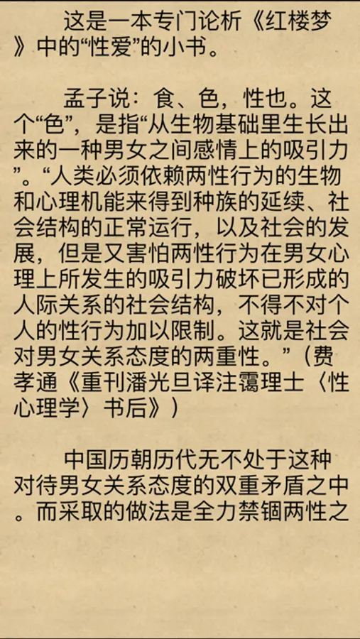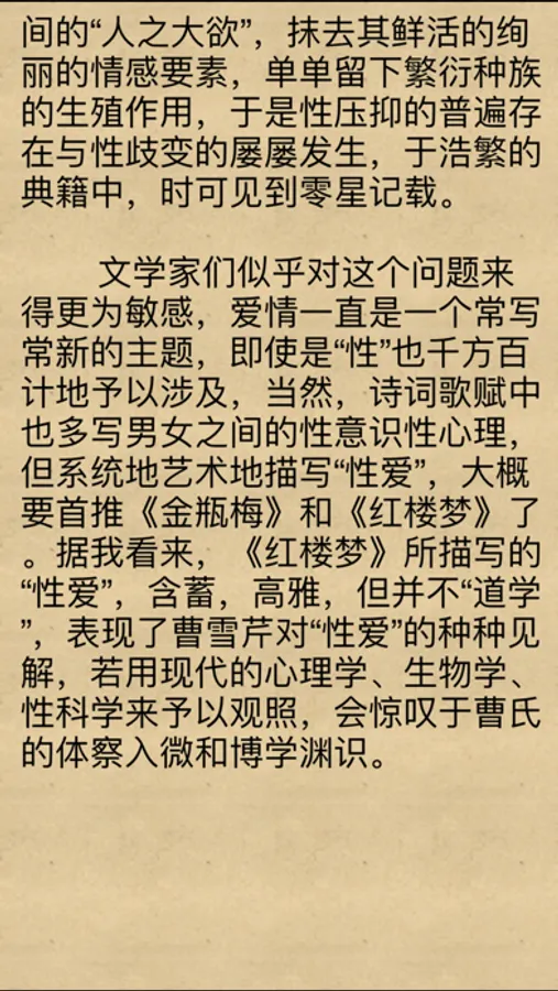 的題旨。加之“性愛”這個題旨曆來諱莫如深,誰都怕染上“誨淫誨盜”的名聲,或避而不說,或說得“發乎情而止乎禮義”的限度,故關于《紅樓夢》中的“性愛”至今論析得-