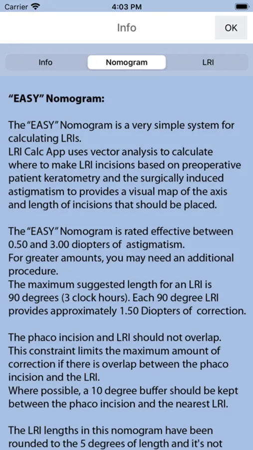 LRI CALC is an iPhone application to assist you in pre-operative planning for Limbal Relaxing Incisions (LRI) to correct the astigmatism.