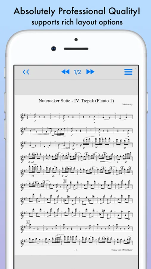 Best fit for professional musicians, music teachers and students. For songwriters, composers and arrangers. For both singers and instrumentalists (piano, violin, cello, guitar, flute, saxophone, trumpet, drums, etc.). Great for writing down ideas, creating lesson materials, creating lead sheets, or creating scores and parts for chorus groups, choirs, chamber orchestras, jazz bands, Latin bands, orchestras, and more. For daily practice, rehearsals, concerts, iWriteMusic will help you enrich your musical life!