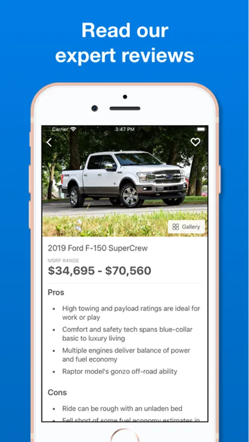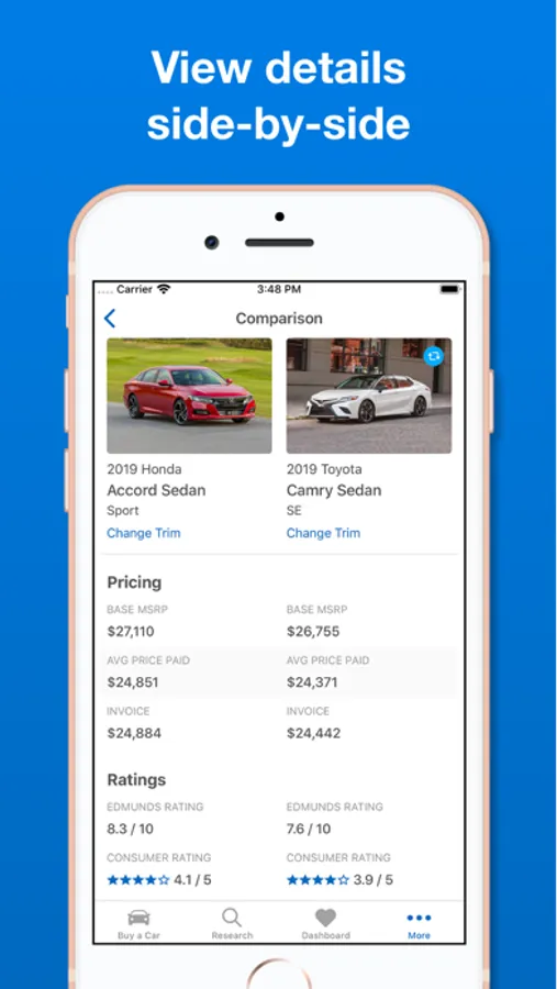 Read Edmunds' expert reviews on thousands of cars and check out our latest videos all in the app. See the latest incentives, consumer reviews, safety ratings, features and specs, True Cost to Own® and photo galleries all on the research tab. You can also write a review for a car right in the app!