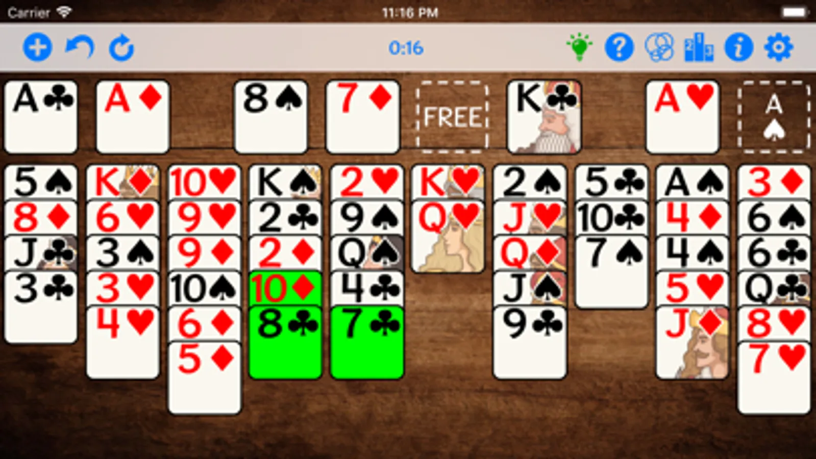 No ads, no tracking. Uncover cards by moving them between 10 cascading stacks and 4 free cells so they fly up and complete the suit stacks. A standard deck is dealt in 10 cascading stacks. You can move the top card of a cascading stack to either an empty free cell or to the top of another cascading stack with top card same suit and one higher value. For example, 3 of clubs can be moved to a stack with top card 4 of clubs. Any value card can be moved to an empty free cell. Only Kings can be moved to an empty cascading stack.