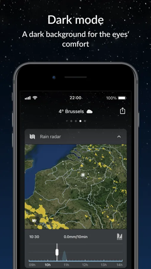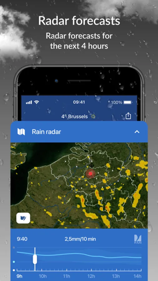 Observations and forecasts of precipitations per 10 minute time step for your favorite Belgian communes (up to 3 hours in advance).