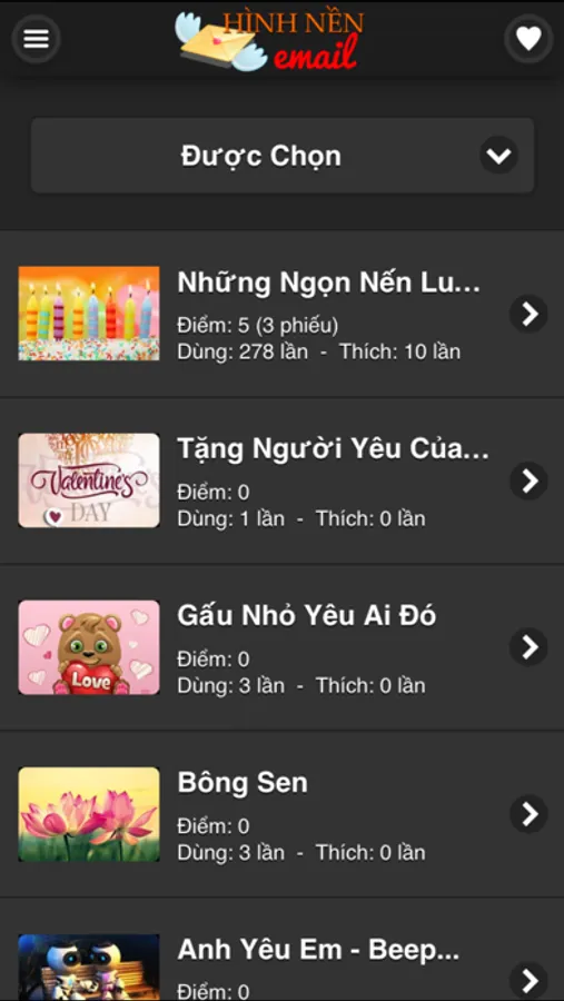 App hiện có rất nhiều chủ đề cho bạn lựa chọn ví dụ Sinh nhật, Kỷ niệm ngày cưới, Tình yêu, Thú vật, Hoa đẹp, Thiên nhiên, Bốn mùa, cùng với một số ngày lễ thông dụng. Chúng tôi tin chắc rằng HinhNenEmail.com sẽ mang đến cho bạn sự thích thú khi sử dụng.