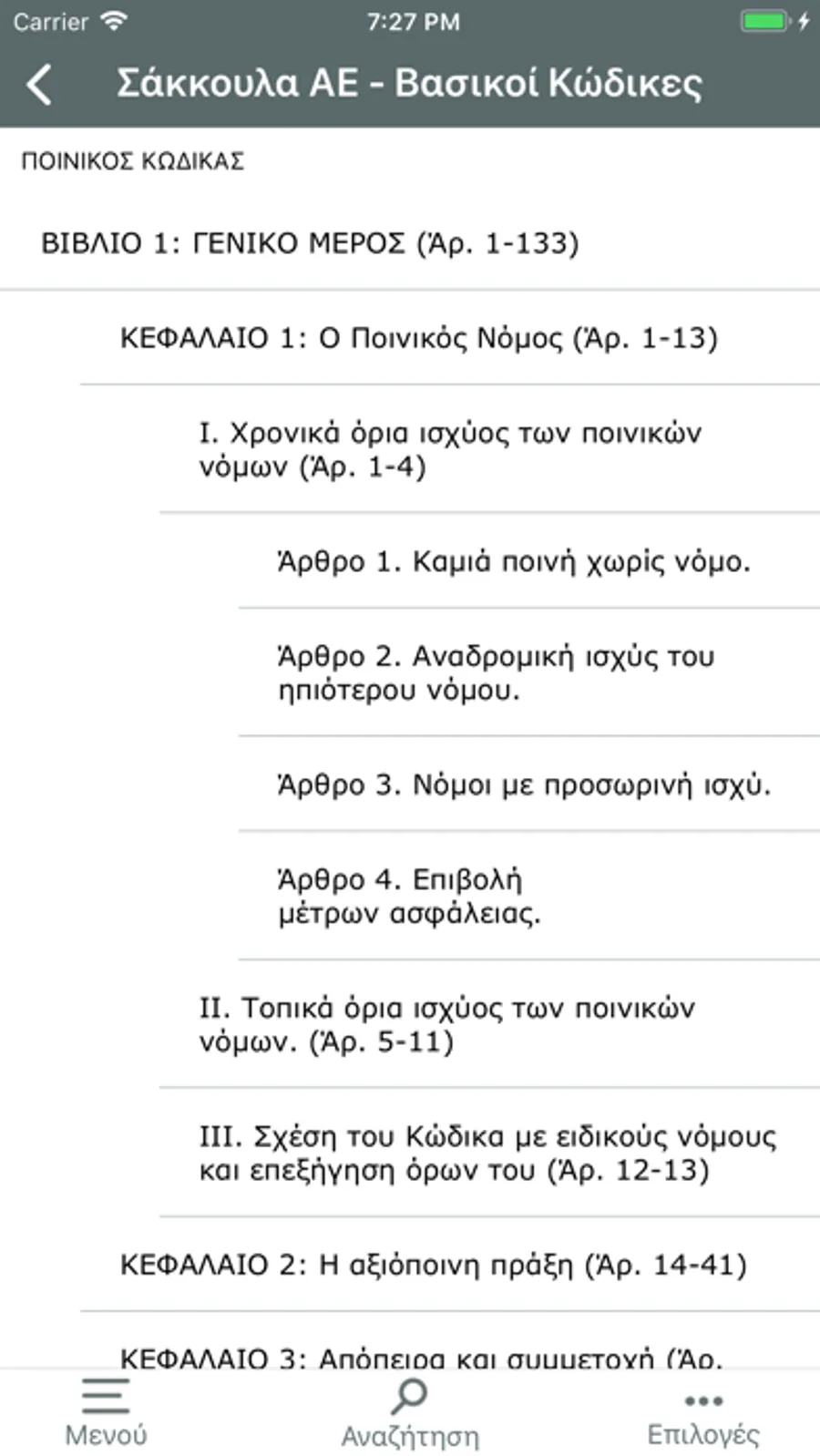 Παρέχεται η δυνατότητα αναζήτησης σε όλα τα περιεχόμενα των κωδίκων και προσθήκης άρθρων στα αγαπημένα.
