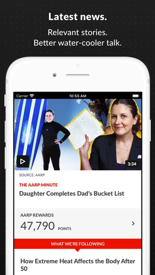 Get more from AARP Now with the AARP Rewards program! Earn Rewards points for downloading the app and visiting the app each day, plus synchronize your favorite fitness tracker or the Health app to get even more points for steps, swimming, and cycling.