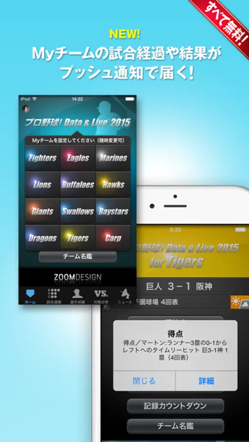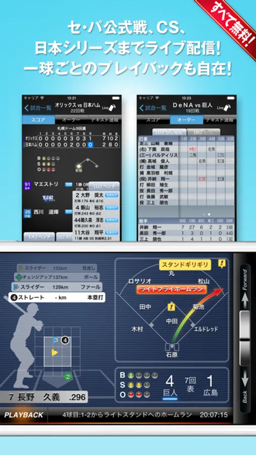 The definitive application for Japanese professional baseball fans that delivers live, pitch-by-pitch coverage of all official games, as well as analytical, comprehensive statistics on all players and all twelve teams belonging to the Nippon Professional Baseball (NPB) organization—all through a rich, versatile user interface. Now completely free!