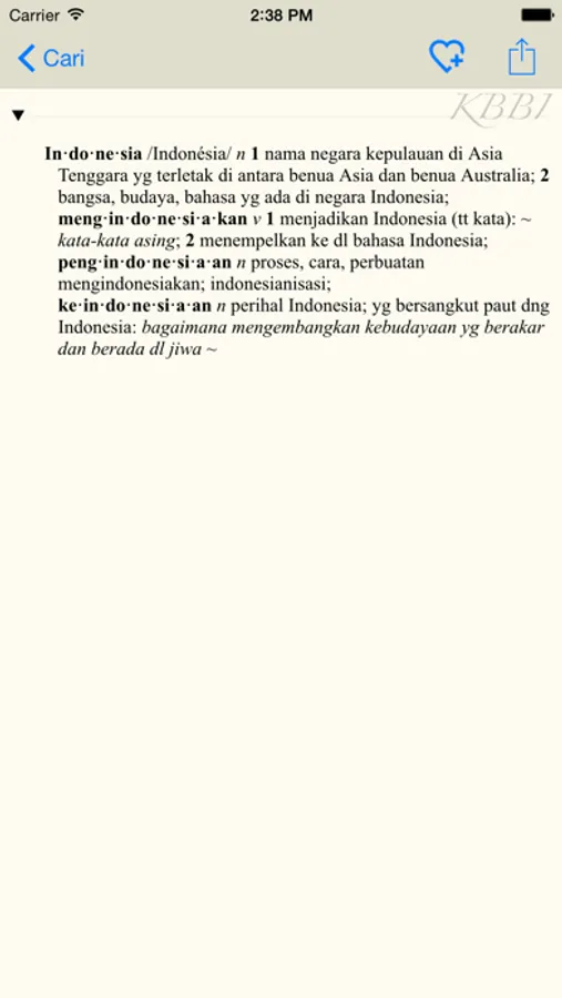 Kamus Besar Bahasa Indonesia (KBBI), literally translated as The Great Dictionary of Indonesian Language, is a dictionary that becomes the primary reference of the standardised Indonesian language. We present you this iPhone application to make it easier for you by only touching and swiping your fingers. It is really user-friendly, practical and handy. In addition, to use this application does not require any internet connection at all. Simply just download it and it's all yours!