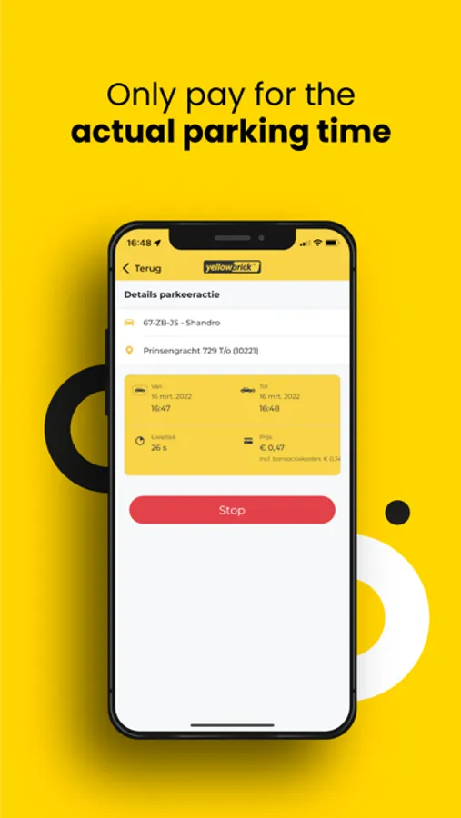 At Yellowbrick you can choose between different packages, ensuring you always have the cheapest option that fits your parking behavior. Select between pay per use or start and stop parking actions for a fixed rate. You can always switch between, and add license plates without additional costs.