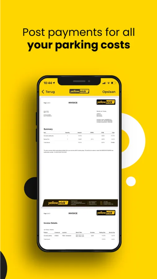 Save administrative time and unnecessary parking costs with Yellowbrick Business. You pay the parking costs afterwards with all parking actions displayed on your monthly invoice.