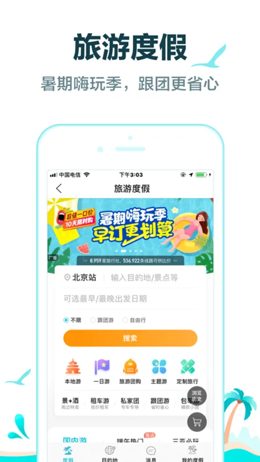 国庆之后错峰去哪儿玩?温泉、滑雪哪里耍?圣诞、跨年哪里不冷还便宜?全站搜索整合全网旅游信息,用先进智能的搜索技术,全面精准满足旅游过程中不同场景的需求。旅行地、主题游玩、住宿、景点、交通出行,一次输入查询,快捷得到所需内容。