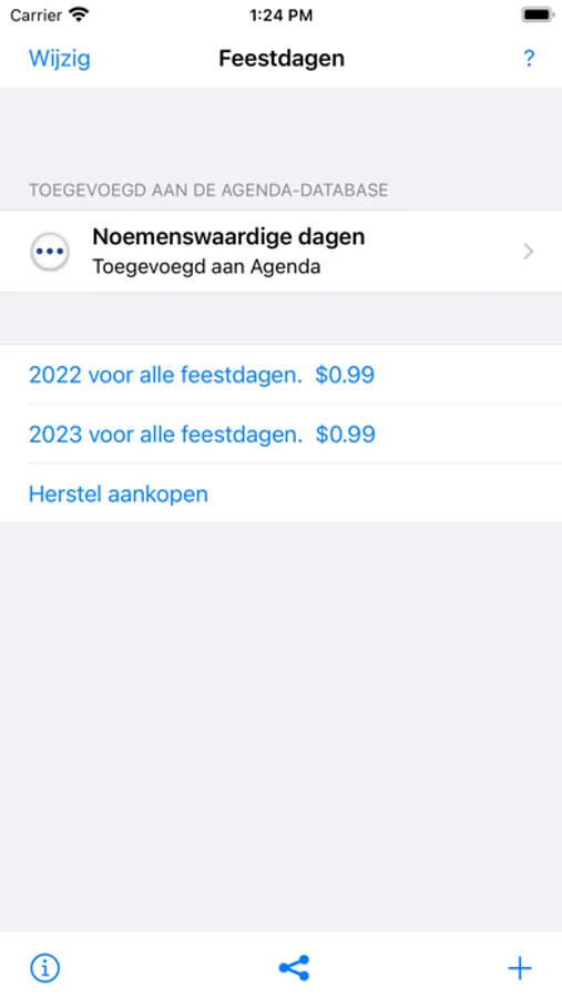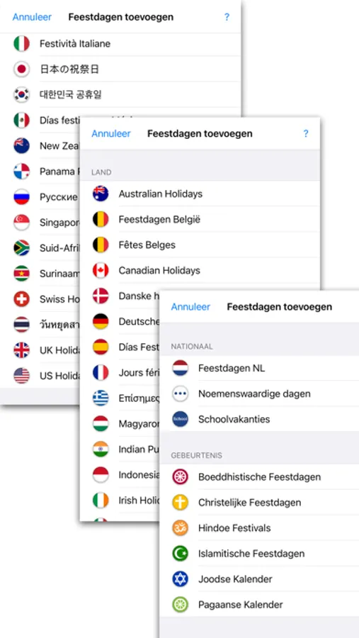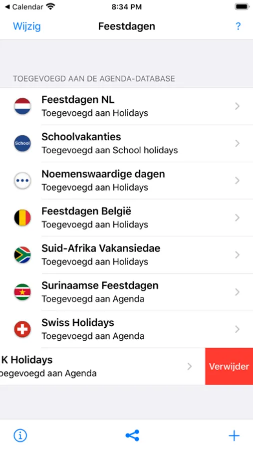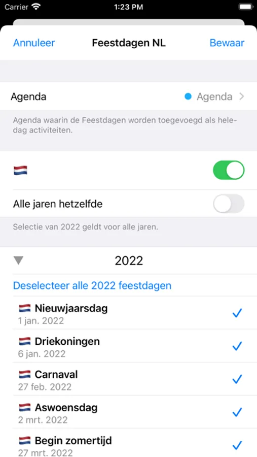 Insert the Dutch holidays into your iPhone calendar with one tap. The holidays will be added as all-day events, you don't need any subscriptions. You can also select beforehand which holidays you want to add to your calendar, and apply this selection across all years. Saves you a lot typing for the upcoming years!