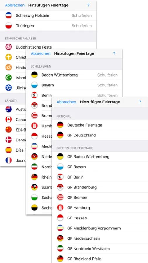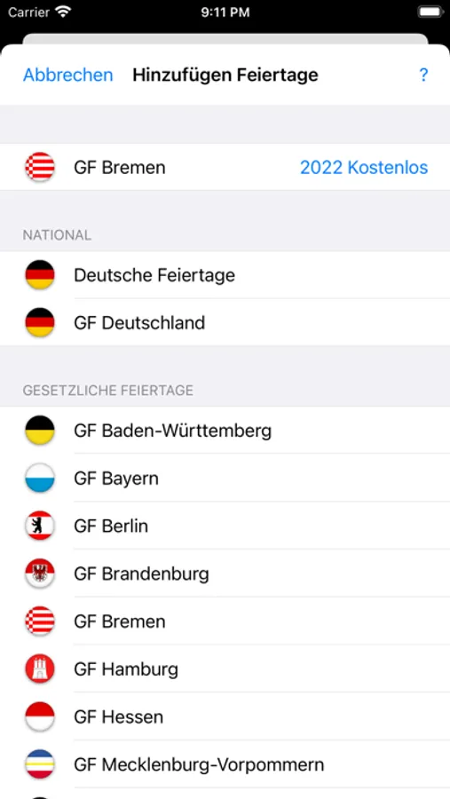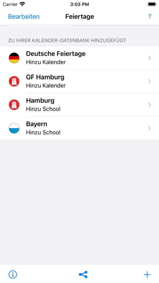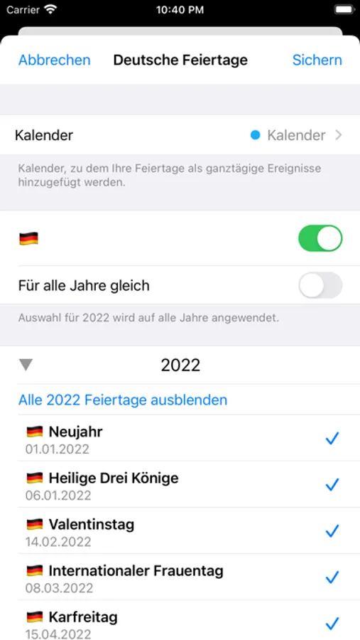 Insert the German holidays and school holidays into your iPhone calendar with one tap. The holidays will be added as all-day events, you don't need any subscriptions. You can also select beforehand which holidays you want to add to your calendar, and apply this selection across all years. Saves you a lot typing for the upcoming years!