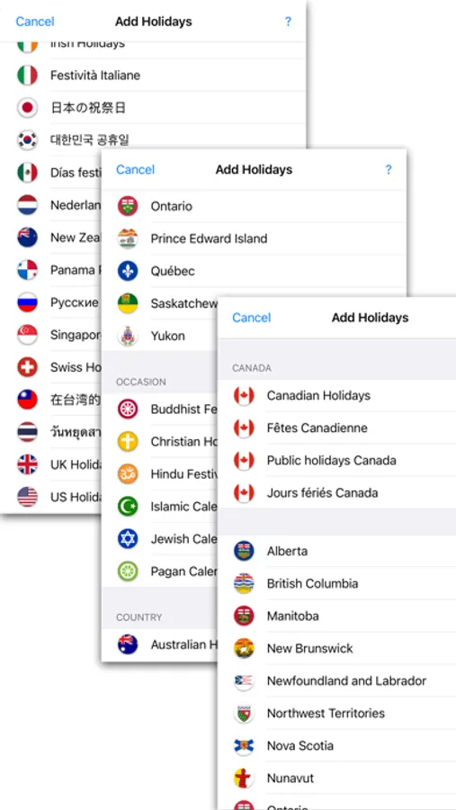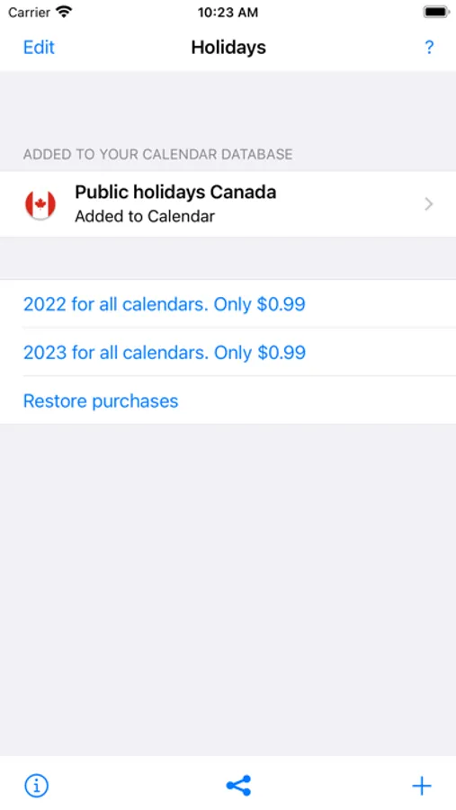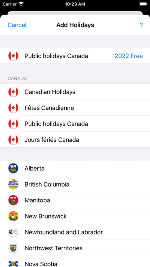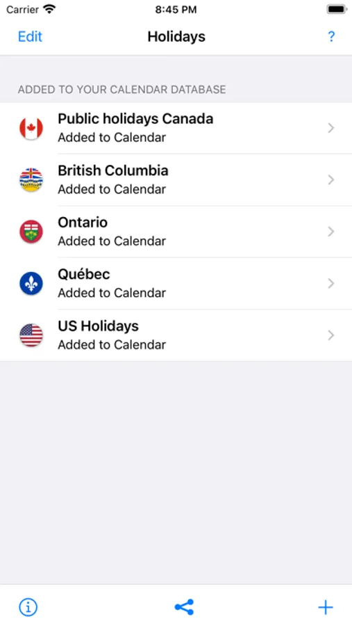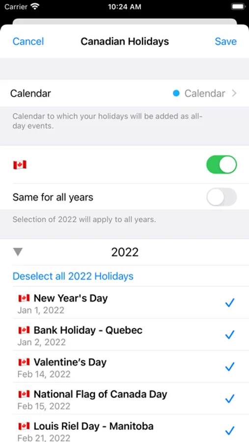 Insert the Canadian holidays into your iPhone calendar with one tap. The holidays will be added as all-day events, you don't need any subscriptions. You can also select beforehand which holidays you want to add to your calendar, and apply this selection across all years. Saves you a lot typing for the upcoming years!