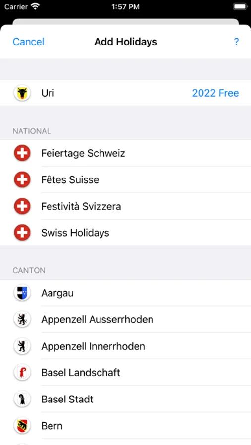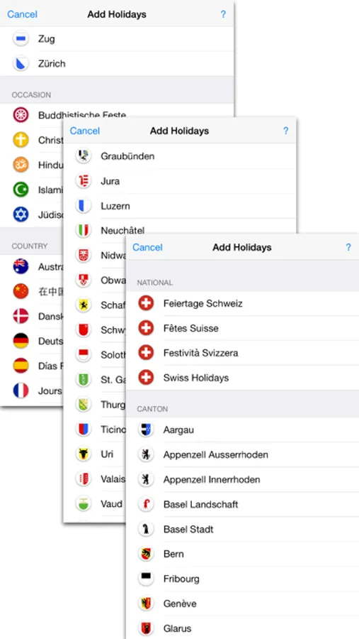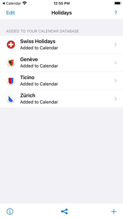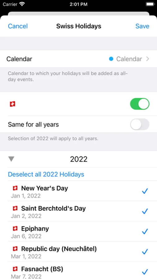 Insert the Swiss holiday into your iPhone calendar with one tap. The holidays will be added as all-day events, you don't need any subscriptions. You can also select beforehand which holidays you want to add to your calendar, and apply this selection across all years. Saves you a lot typing for the upcoming years!