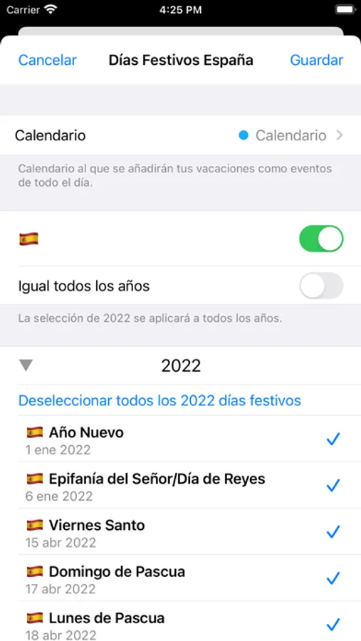 También puedes seleccionar previamente las festividades que deseas añadir. Una vez que se han agregado todos los días de fiesta, fácilmente los podrás editar, eliminar o mover a otro calendario y sincronizarlos con Google Calendar, Outlook, iCloud, etc.