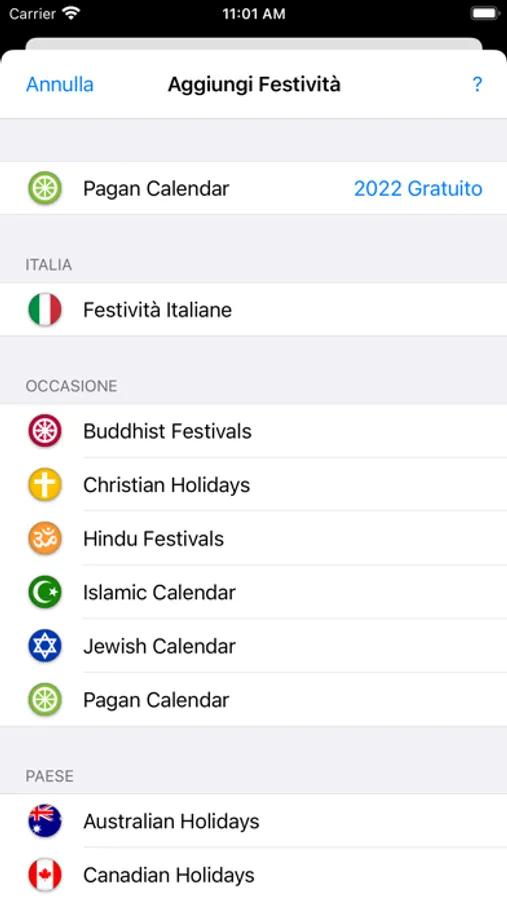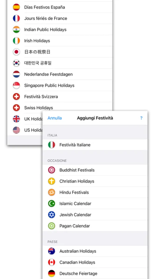 È inoltre possibile selezionare in anticipo quali vacanze desideri aggiungere al tuo calendario. Una volta aggiunte, tutti i giorni festivi possono essere facilmente modificati, cancellati o spostati su un altro calendario e sincronizzati con GoogleCalendar, Outlook, iCloud, etc.
