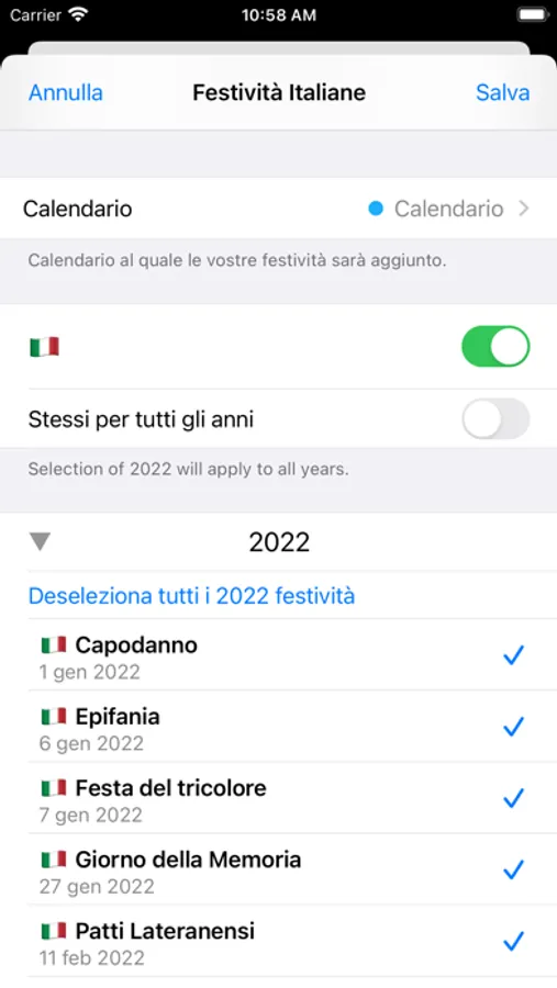 - Seleziona in anticipo quali vacanze/anni desideri aggiungere al tuo calendario.