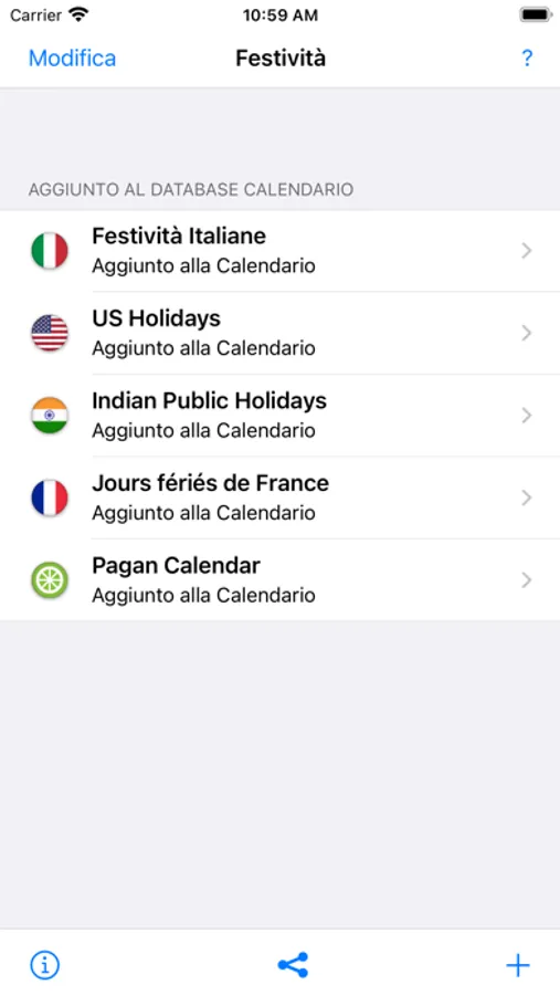 Inserire le festività italiane nel tuo calendario di iPhone con un solo tocco. Le vacanze saranno aggiunte come eventi che durano tutto il giorno nel calendario a vostra scelta..