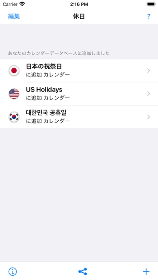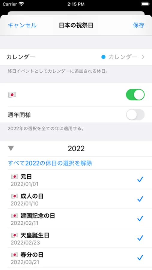 Insert the Japanese holidays into your iPhone calendar with one tap. The holidays will be added as all-day events, you don't need any subscriptions. You can also select beforehand which holidays you want to add to your calendar, and apply this selection across all years. Saves you a lot typing for the upcoming years!