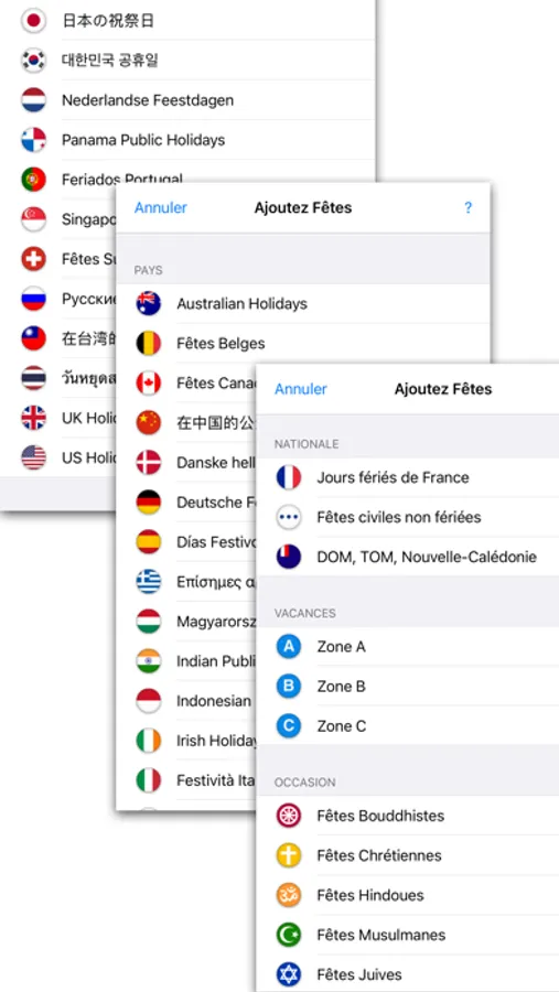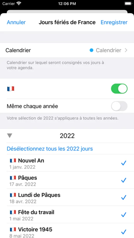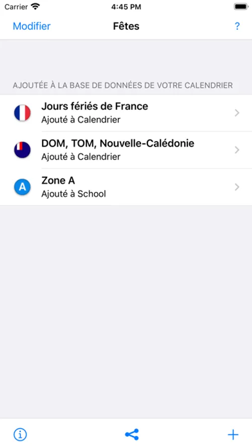 Insert the French holidays and school holidays into your iPhone calendar with one tap. The holidays will be added as all-day events, you don't need any subscriptions. You can also select beforehand which holidays you want to add to your calendar, and apply this selection across all years. Saves you a lot typing for the upcoming years!